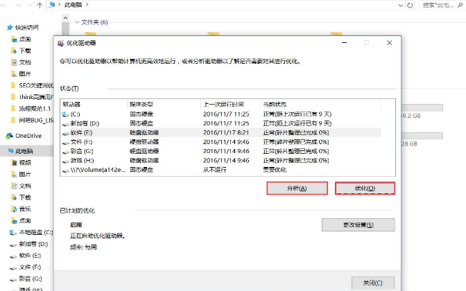选中需要优化的分区,点击分析,可以看到是否需要整理。需要整理的话,点击整理即可
